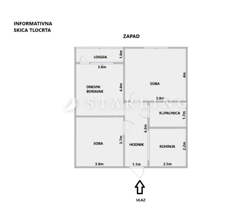 Stan se sastoji od dnevnog boravka, blagovaonice s kuhinjom, dvije spavaće sobe, kupaonice, hodnika i lođe.