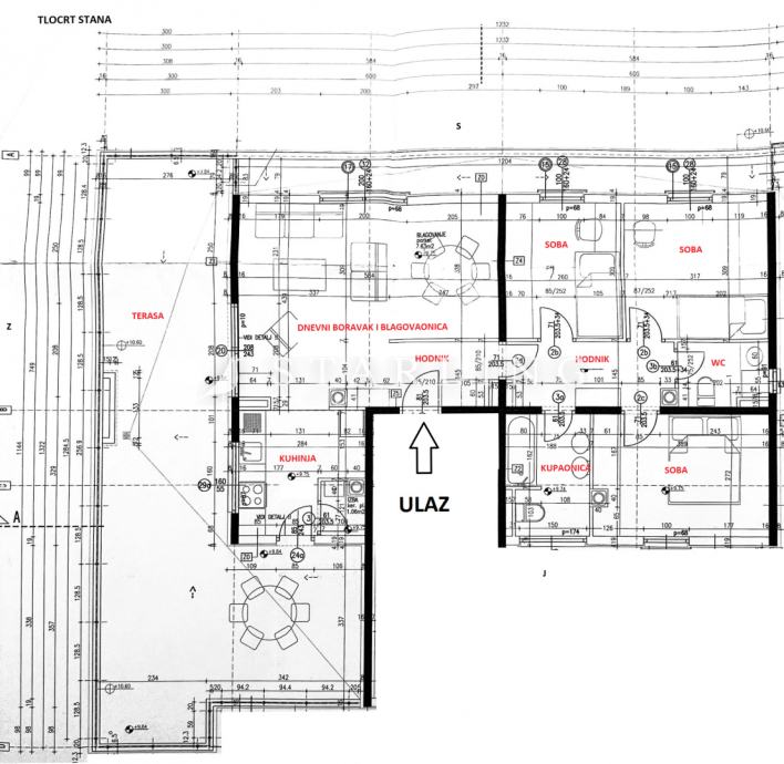 Stan se sastoji od dnevnog boravka, kuhinje i blagovaonice, tri sobe, kupaonice s wc-om, odvojenog wc-a, ostave, hodnika i terase bruto korisne površine 45 m2.