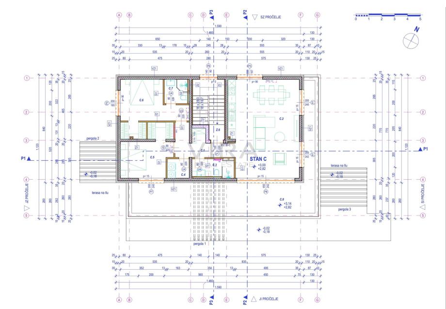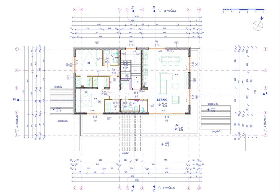 Stan se sastoji od dnevnog boravka, kuhinje s blagovaonicom, dvije spavaće sobe, kupaonice s wc-om ulaznog hodnika i terase.