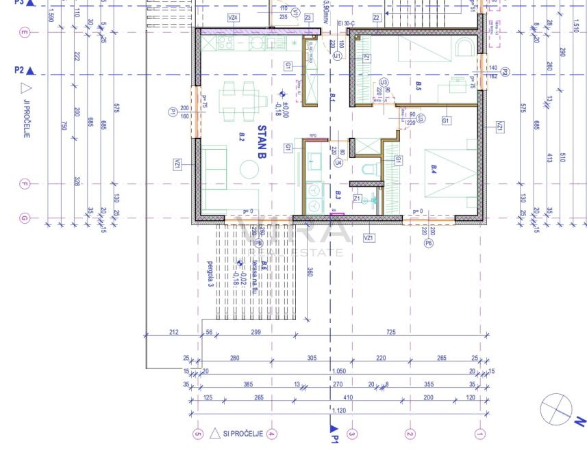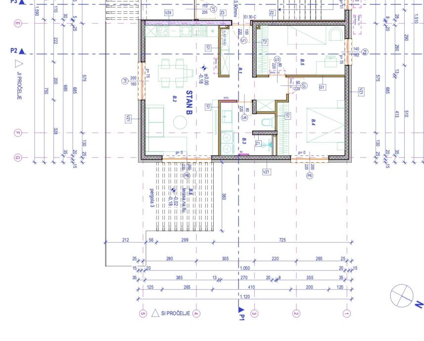 Stan se sastoji od dnevnog boravka, kuhinje s blagovaonicom, dvije spavaće sobe, kupaonice s wc-om ulaznog hodnika i terase.