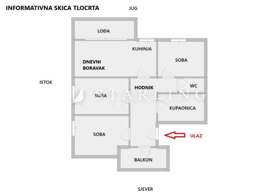 Stan se sastoji od prostranog dnevnog boravka s blagovaonicom, kuhinje, tri spavaće sobe, kupaonice, zasebnog wc-a, hodnika i dva balkona.