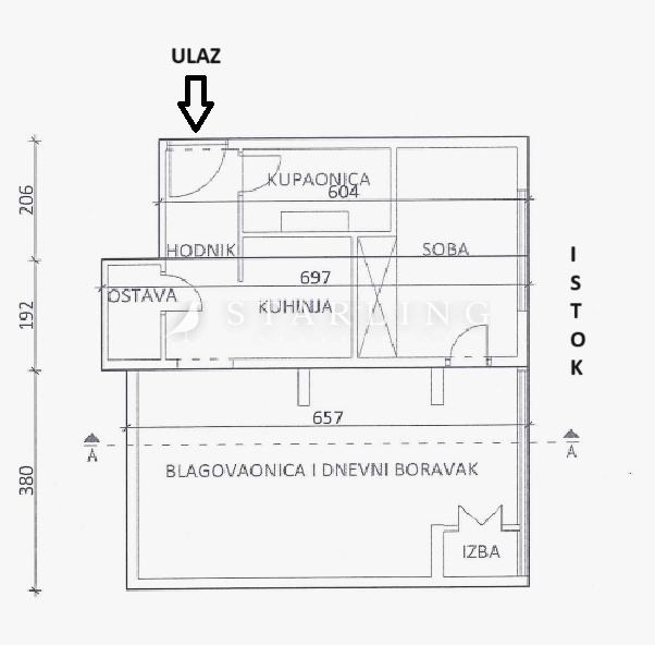 Stan se sastoji od dnevnog boravka, blagovaonice, kuhinje, spavaće sobe, kupaonice s wc-om, hodnika i ostave.