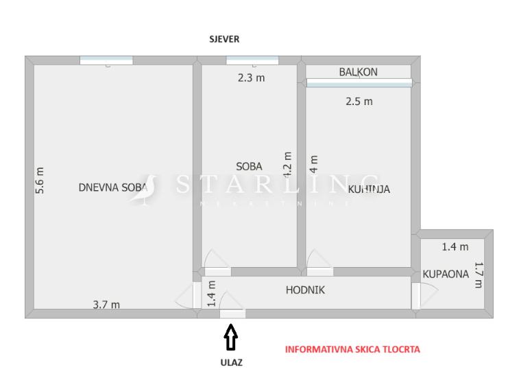 Stan se sastoji od dnevnog boravka, kuhinje, sobe, kupaonice s wc-om, predsoblja i balkona.