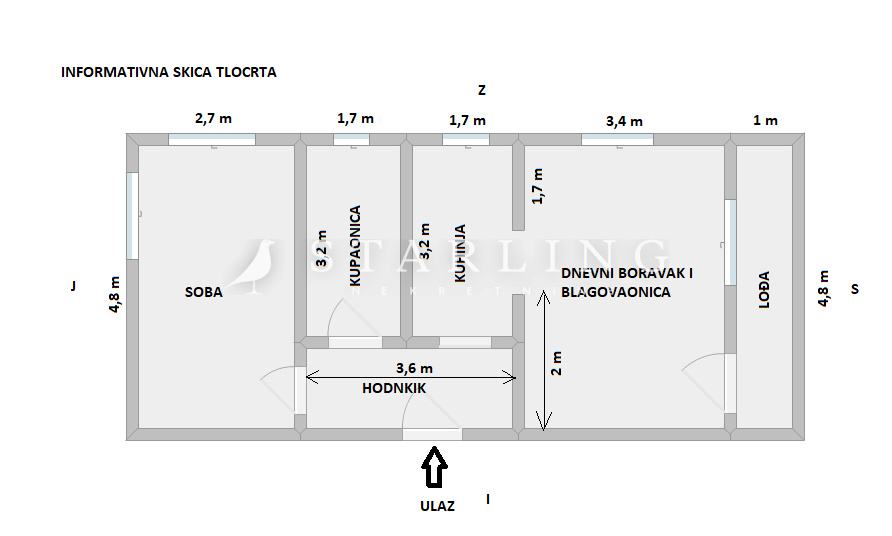 Stan se sastoji od dnevnog boravka i blagovaonice, kuhinje, spavaće sobe, kupaonice, hodnika i lođe.