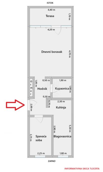 Stan se sastoji od ulaznog hodnika, dnevnog boravka, kuhinje, blagovaonice, spavaće sobe, kupaonice s wc-om i terase. Uz stan dolazi spremište u podrumu zgrade.