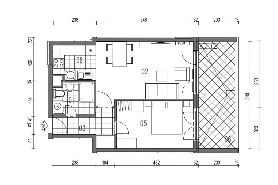 Stan se sastoji od dnevnog boravka, kuhinje, blagovaonice, spavaće sobe, hodnika, kupaonice s wc-om i loggie.