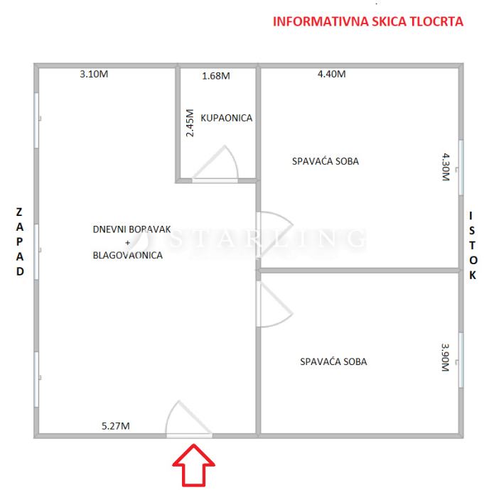 Stan se sastoji od dnevnog boravka s kuhinjom i blagovaonicom, dvije sobe, kupaonice s wc-om i hodnika.
