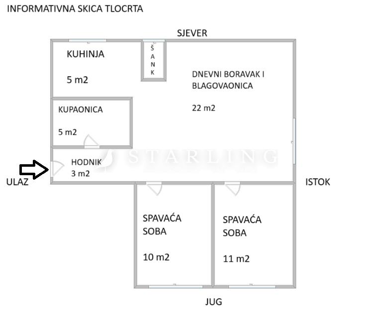Prodaje se trosoban stan neto površine 64 m2 na drugom katu zgrade bez lifta.