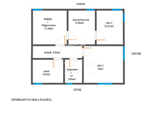 Stan se sastoji od dnevnog boravka, kuhinje i blagovaonice, 3 spavaće sobe, kupaonice s wc-om te hodnika.