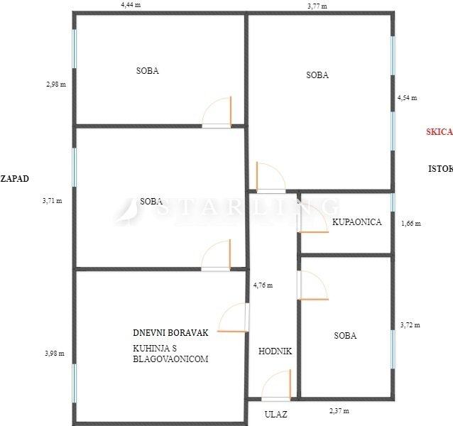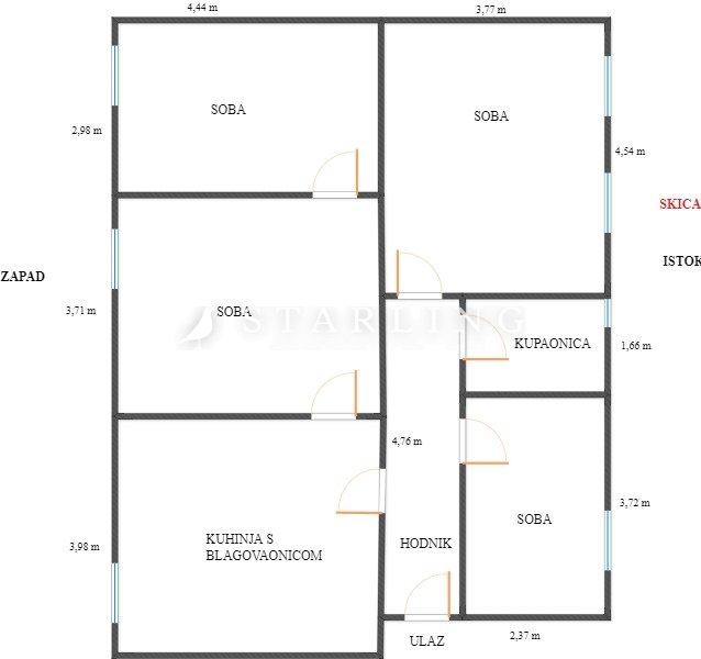 Stan se sastoji od ulaznog hodnika, dnevnog boravka, kuhinje s blagovaonicom, tri spavaće sobe i kupaonice.