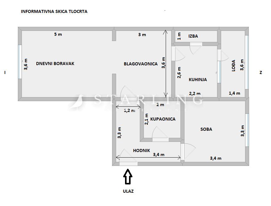 Stan se sastoji od dnevnog boravka, kuhinje, blagovaonice, spavaće sobe, kupaonice s wc-om, ostave, hodnika i lođe.