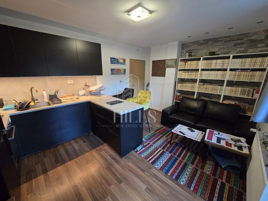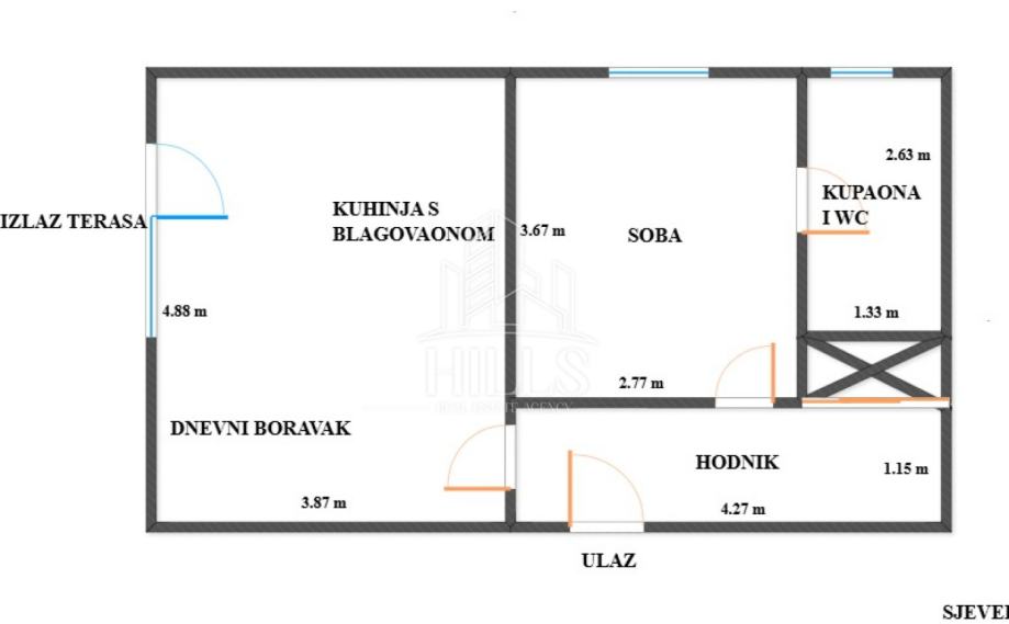 Stan se sastoji od dnevnog boravka s kuhinjom i blagovaonicom, sobe, hodnika te kupaonice s wc-om.