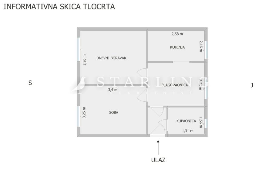 Stan se sastoji od dnevnog boravka, blagovaonice, kuhinje, spavaće sobe, kupaonice s wc-om i ulaznog hodnika.