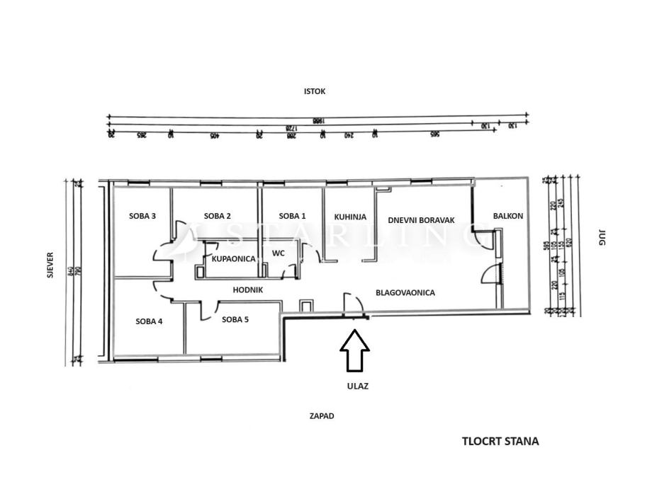 Stan se sastoji od dnevnog boravka, kuhinje, blagovaonice, 5 soba, kupaonice, wc-a, loggie i hodnika.
