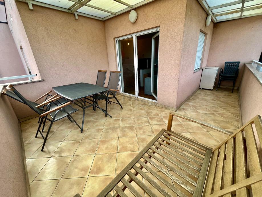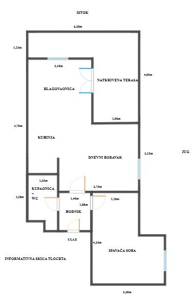Stan se sastoji od dnevnog boravka, kuhinje i blagovaonice, spavaće sobe, hodnika, kupaonice i wc-a te natkrivene terase.
