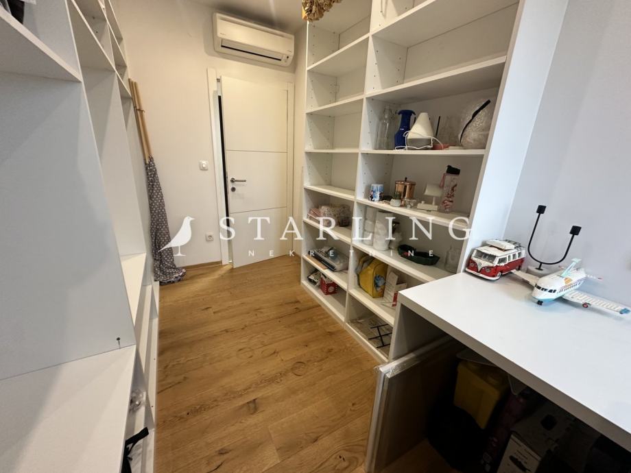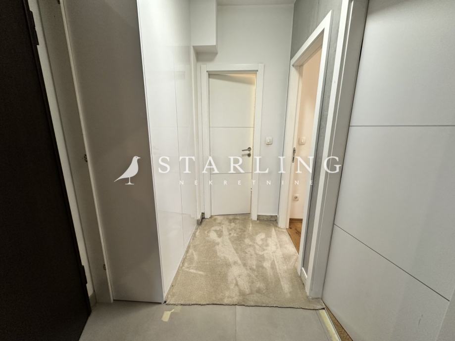 Stan se sastoji od dnevnog boravka s kuhinjom i blagovaonom koje izlaze na balkon zapadne orijentacije s pogledom na zelenilo, dvije spavaće sobe, hodnika i kupaonice. Odličan tlocrt s dvostranom orijentacijom.