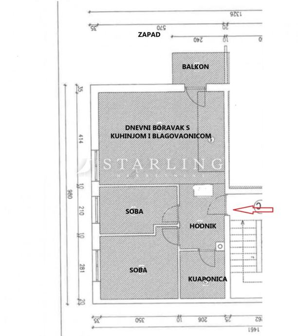 Površina stana iznosi 53 m2, a ukupna površina s vanjskim parkingom i ostavom u podrumu (obračunato po koeficijentu) iznosi 59 m2.