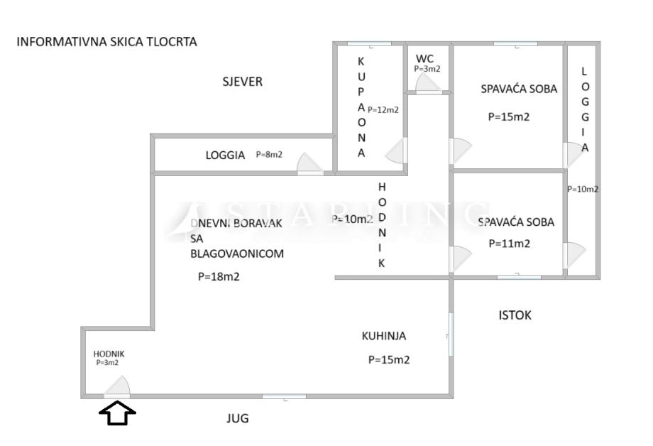 Stan se sastoji od dnevnog boravka, kuhinje, dvije spavaće sobe, kupaonice, wc-a, hodnika i 2 loggie.