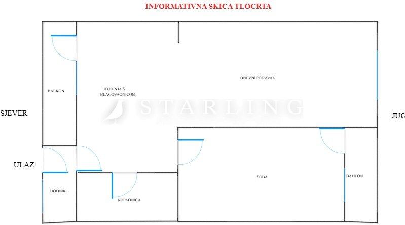 Stan se sastoji od dnevnog boravka s blagovaonicom i kuhinjom, spavaće sobe, ulaznog hodnika, kupaonice s wc-om i dva balkona.