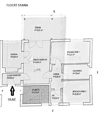 Stan se sastoji od dnevnog boravka, kuhinje i blagovaonice, dvije spavaće sobe, kupaonice, odvojenog wc-a, hodnika i natkrivene terase s vrtom bruto površine 37m2.