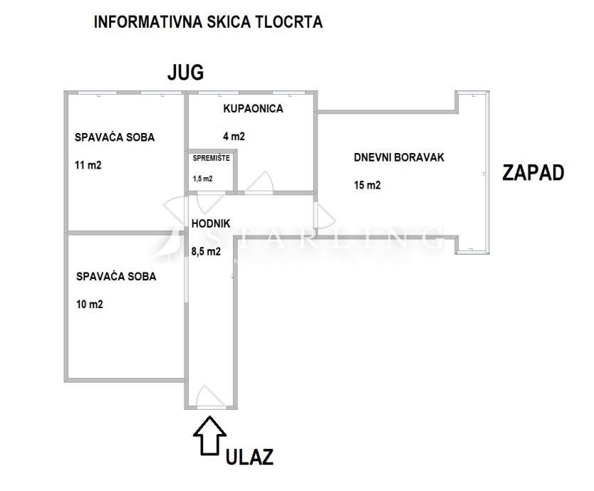 Orijentacija je jug - zapad što pruža mnoštvo dnevnog svjetla te se zapadni dio dnevnog boravka može gotovo u potpunosti otvoriti.