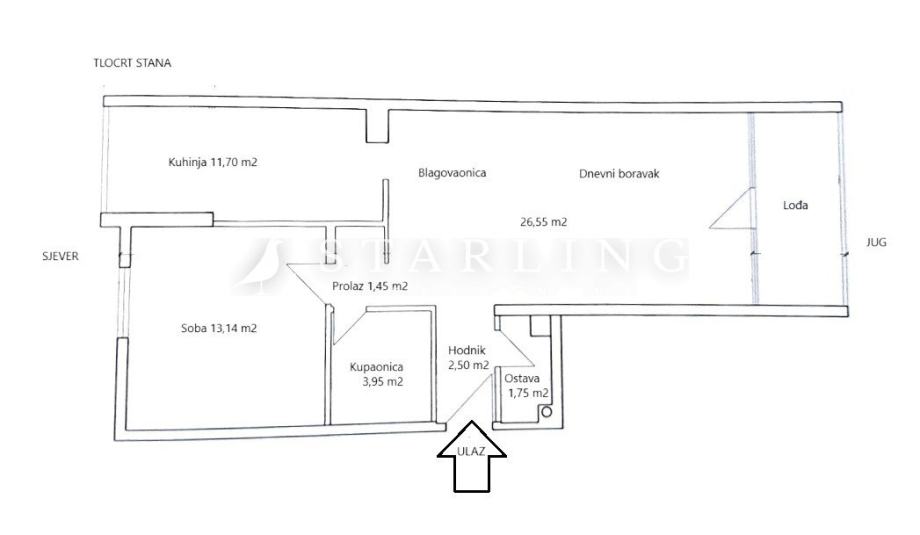 Stan ima 67 m2, a sastoji se od dnevnog boravka integriranog s blagovaonicom, kuhinje, spavaće sobe, kupaonice s wc-om, ostave, hodnika i loggie.