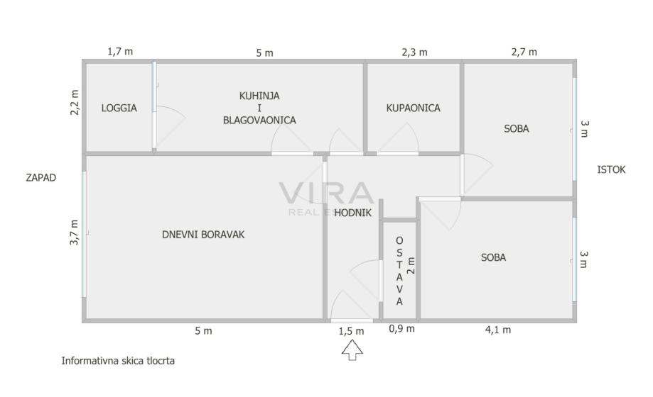 Stan se sastoji od dnevnog boravka, kuhinje s blagovaonicom, 2 spavaće sobe, kupaonice, hodnika, loggie i ostave.