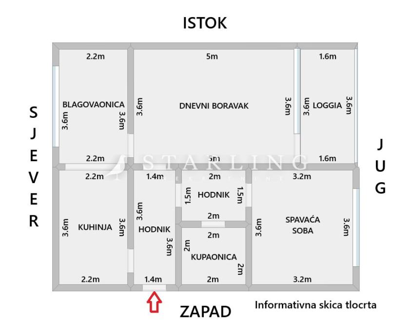 Stan se sastoji od dnevnog boravka, kuhinje, blagovaonice, spavaće sobe, kupaonice, loggie, dva hodnika i spremišta (1 m2).