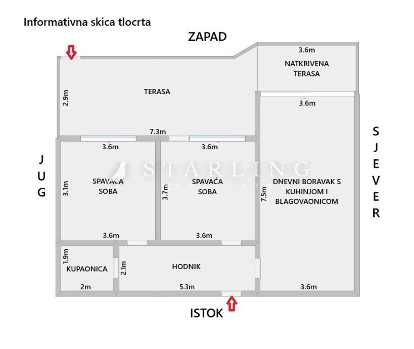 Stan se sastoji od dnevnog boravka s kuhinjom i blagovaonicom, dvije spavaće sobe, kupaonice, natkrivene terase, nenatkrivene terase, hodnika i spremišta (tavan).