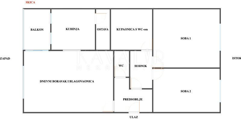 Stan se sastoji od dnevnog boravka i blagovaonice, kuhinje, dviju spavaćih soba, kupaonice sa WC-om, dodatnog WC-a, ostave, predsoblja, hodnika i loggie.