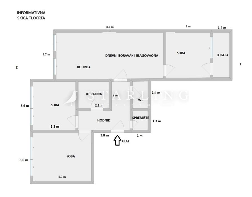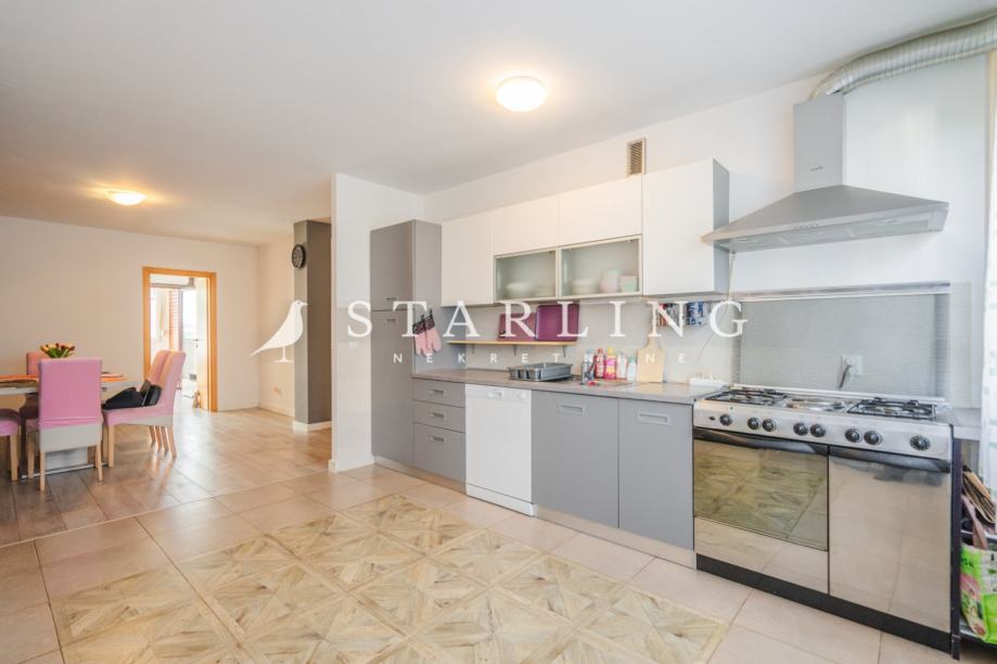 Stan se sastoji od open-space dnevnog boravka s kuhinjom i blagovaonom, tri spavaće sobe, kupaonice s WC-om, WC-a, hodnika, ostave i lođe.