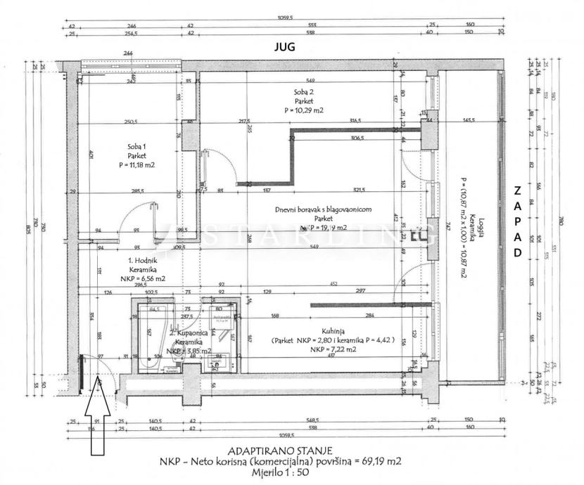 Stan se sastoji od dnevnog boravka, kuhinje s blagovaonicom, dvije spavaće sobe, kupaonice s wc-om, hodnika i lođe.