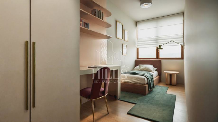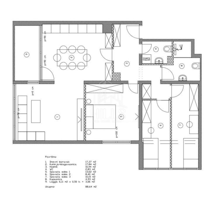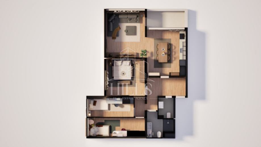 Stan se sastoji od dnevnog boravka, kuhinje, blagovaonice, 3 spavaće sobe, kupaonice, wc -a, hodnika i balkona.
