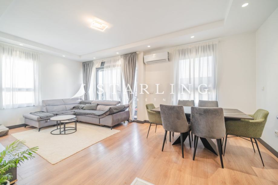 Stan se sastoji od dnevnog boravka s blagovaonicom i kuhinjom, dvije spavaće sobe, kupaonice s wc-om, ulaznog hodnika i natkrivenog balkona.