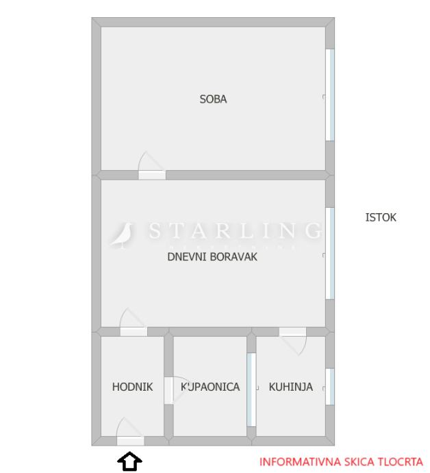 Stan se sastoji od dnevnog boravka s blagovaonicom, kuhinje, sobe, kupaonice s wc-om, te hodnika.