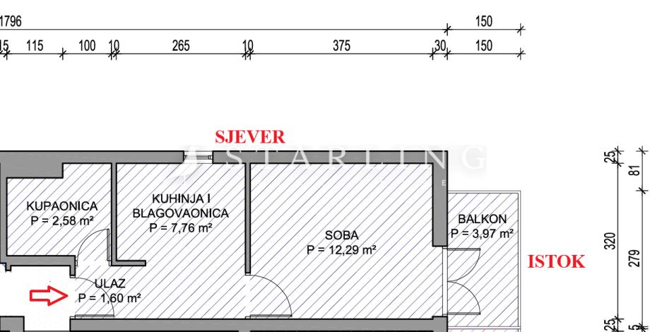Stan se sastoji se od dnevnog boravka/sobe, kuhinje s blagovaonicom, kupaonice s wc-om, ulaznog hodnika i balkona.
