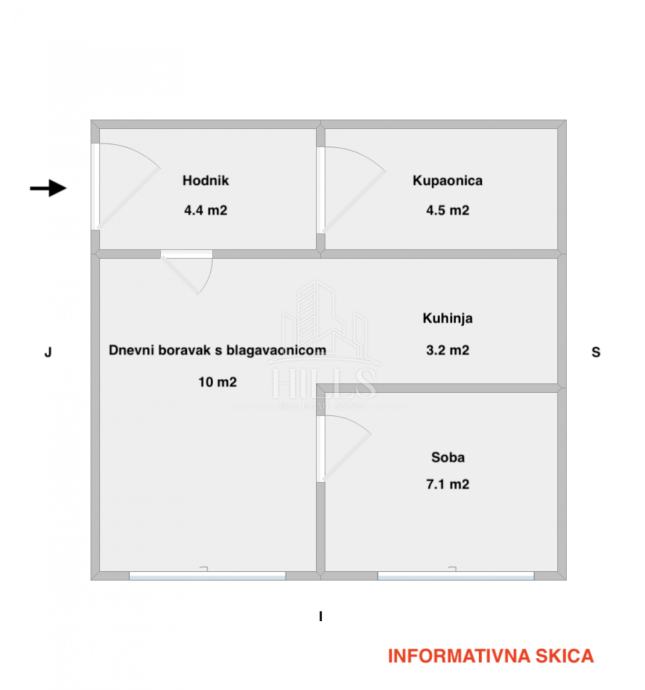 Stan se sastoji od dnevnog boravka s blagovaonicom i kuhinjom, pregrađene spavaće sobe, kupaonice, wc-a i hodnika.
