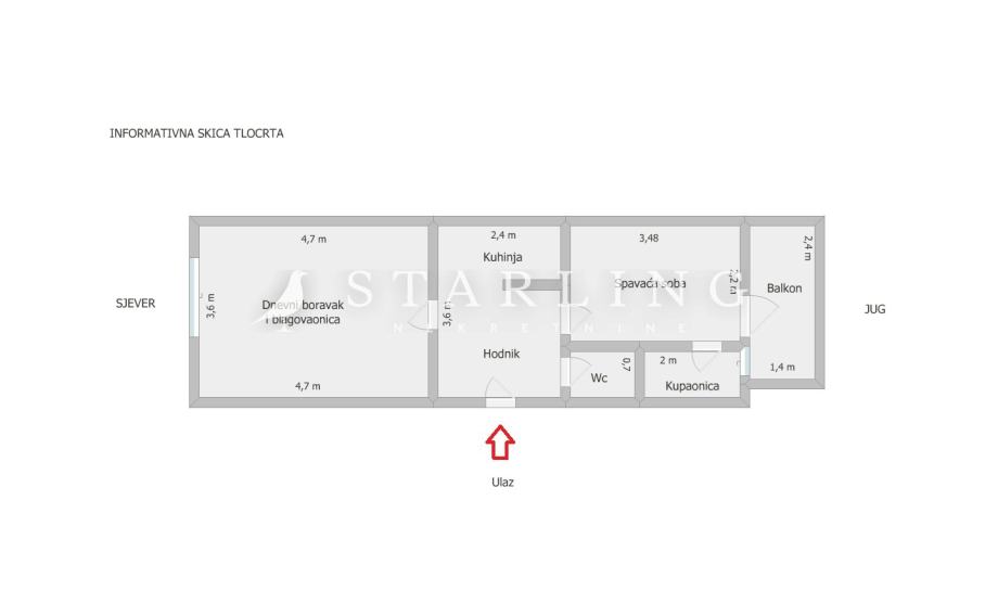 Stan se sastoji od dnevnog boravka s blagovaonicom, kuhinje, spavaće sobe, kupaonice, odvojenog wc-a, hodnika i balkona.