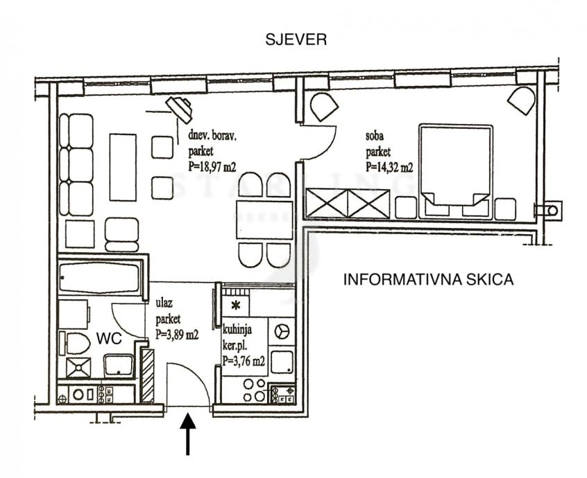 Stan se sastoji od dnevnog boravka i blagovaonice, kuhinje, spavaće sobe, kupaonice s wc-om i hodnika.
