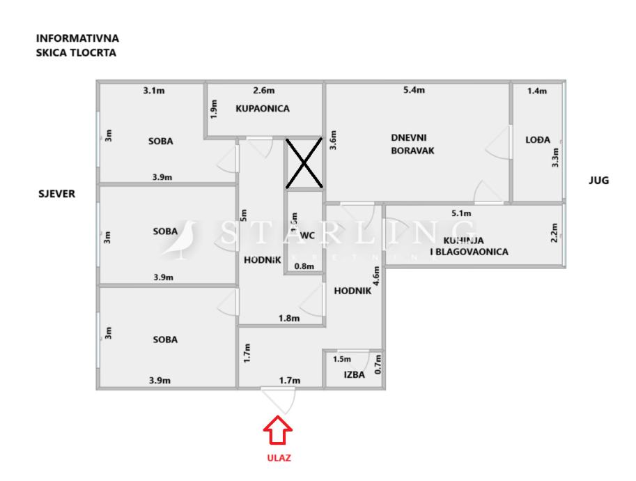 Stan se sastoji od dnevnog boravka, kuhinje s blagovaonicom, tri spavaće sobe, kupaonice s wc-om, wc-a, izbe i zatvorene loggie.