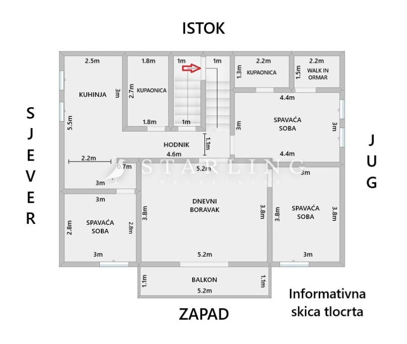 Stan se sastoji od dnevnog boravka s blagovaonicom, kuhinje, tri spavaće sobe, manje galerijske sobe, dvije kupaonice, prostora za walk in ormar, balkona, hodnika, spremišta i vanjskog nenatkrivenog parkirnog mjesta. Spremište koje se nalazi ispod stubišta u prizemlju zgrade, kao i vanjsko nenatkriveno parkirno mjesto su izvanknjižno vlasništvo.