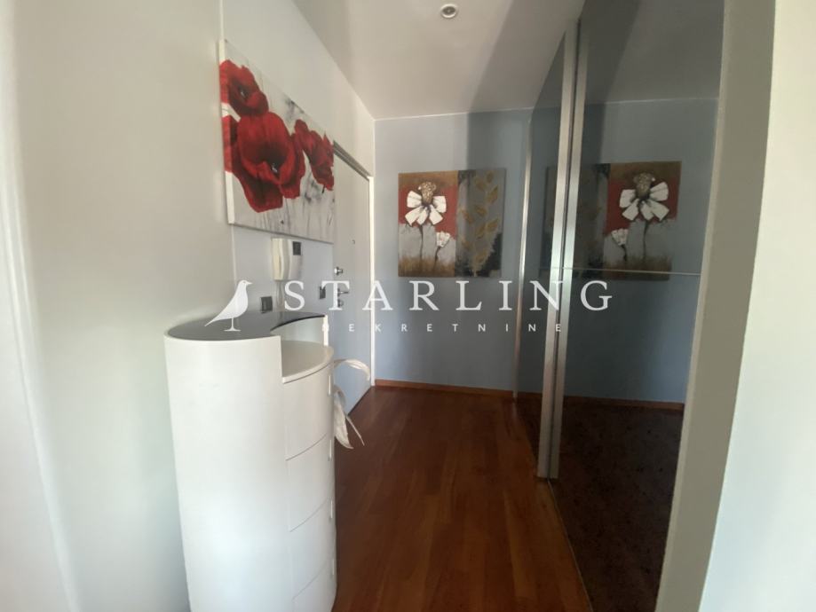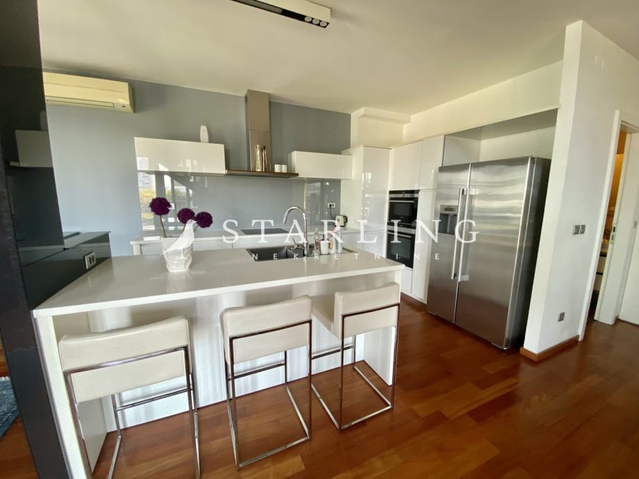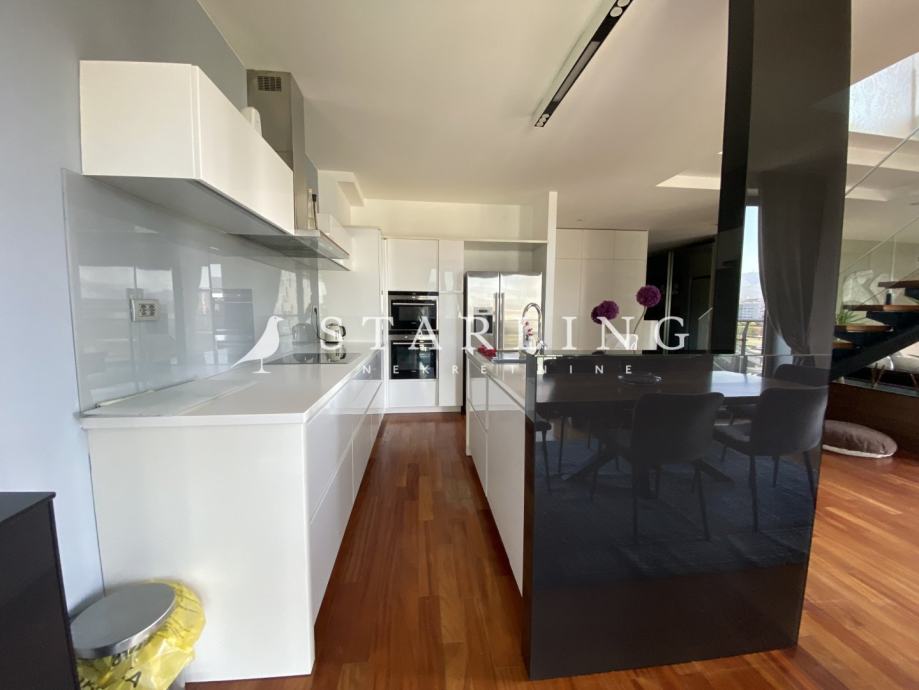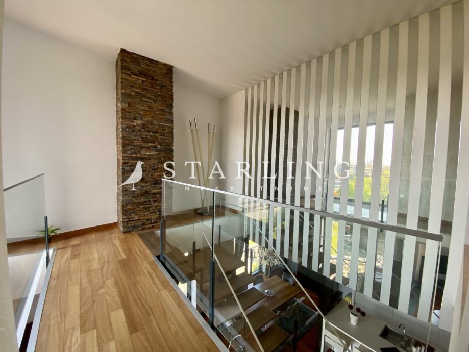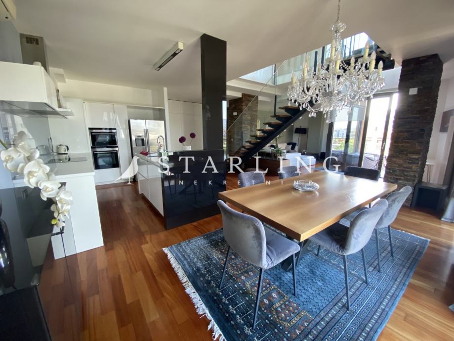 Ulaz u stan se nalazi na petom katu koji se sastoji od dnevnog boravka, kuhinje, blagovaonice, gostinjske sobe, wc, hodnika i terase. Na drugoj etaži nalazi se master spavaća soba s vlastitom kupaonicom i garderobom, dvije spavaće sobe, walk-in ormar, kupaonica, terasa i hodnik.
