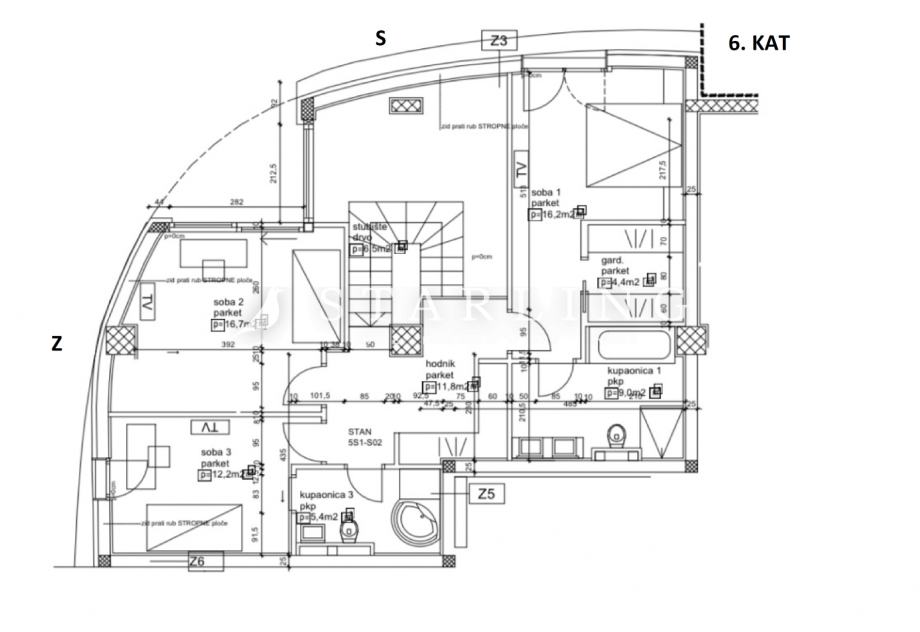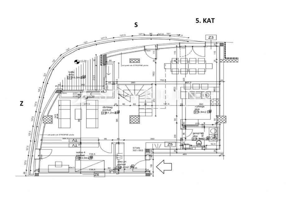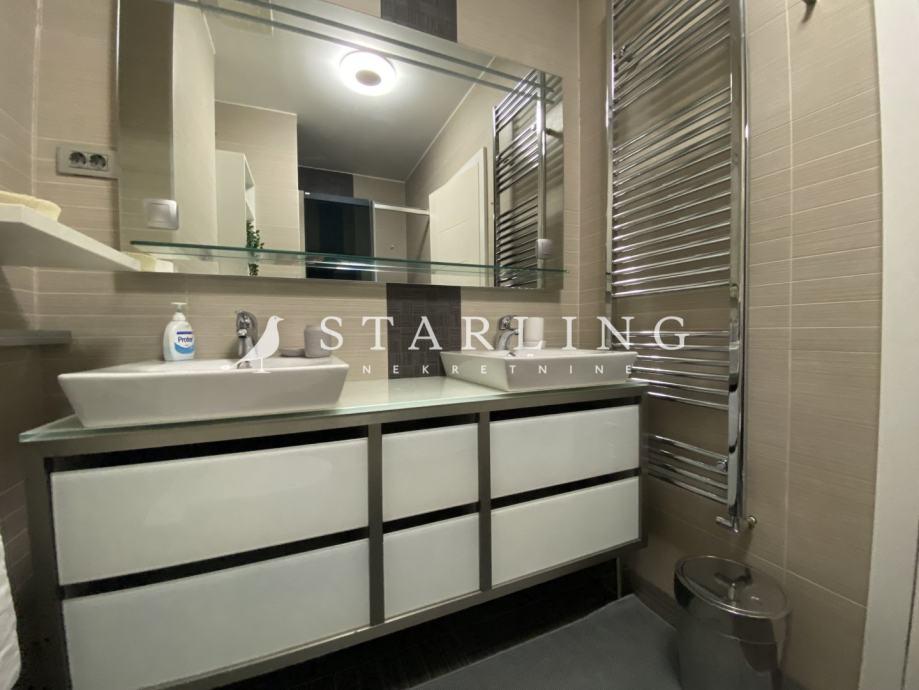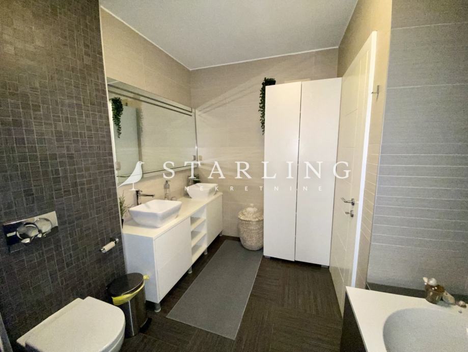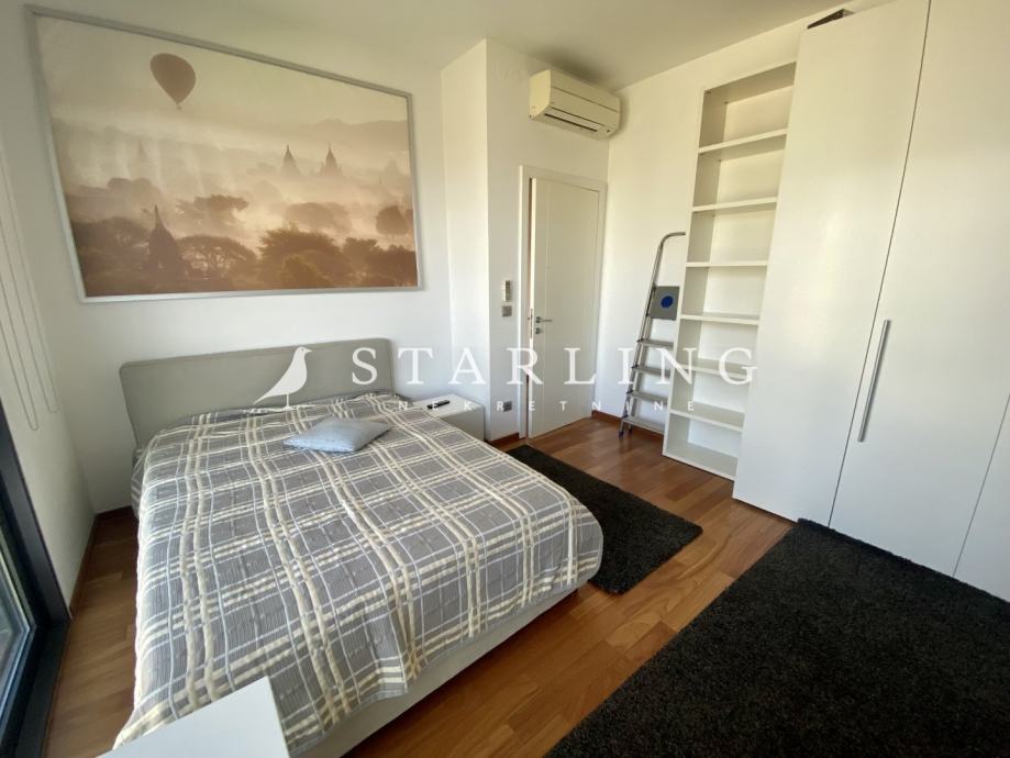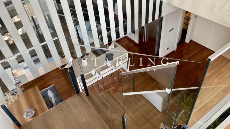 Ulaz u stan se nalazi na petom katu koji se sastoji od dnevnog boravka, kuhinje, blagovaonice, gostinjske sobe, wc, hodnika i terase. Na drugoj etaži nalazi se master spavaća soba s vlastitom kupaonicom i garderobom, dvije spavaće sobe, walk-in ormar, kupaonica, terasa i hodnik.