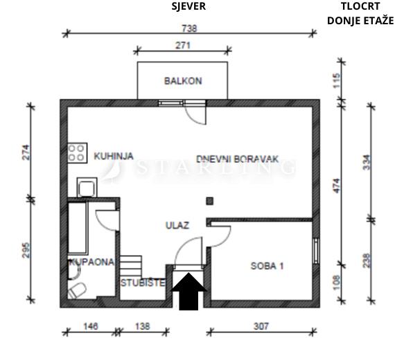Donja etaža: dnevni boravak, kuhinja s blagovaonicom, spavaća soba, kupaonica, balkon i ulazni prostor.