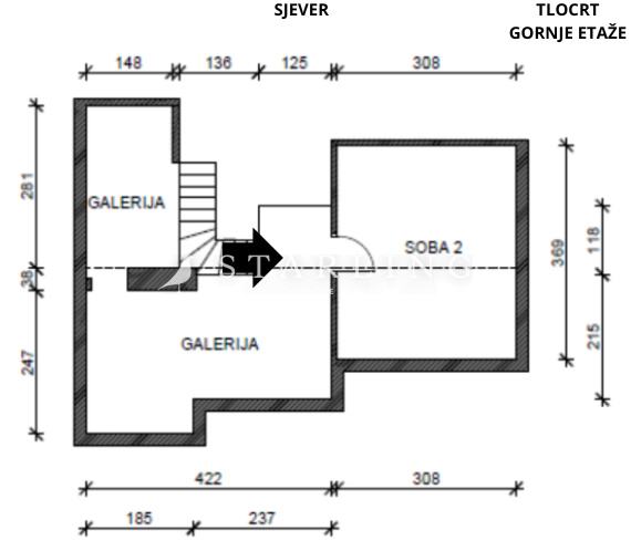Gornja etaža (potkrovlje): spavaća soba, galerija i hodnik.