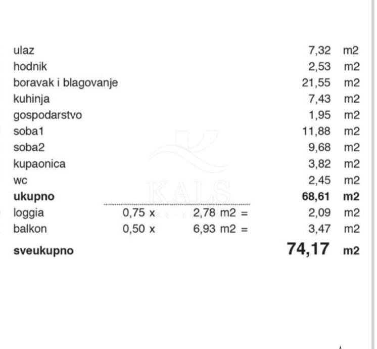 Stan je potpuno nov, sastoji se od dnevnog boravka, kuhinje s blagovaonicom, dvije spavaće sobe, kupaonice s wc-om, wc-a, balkona i loggie.