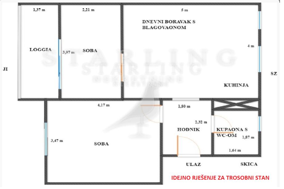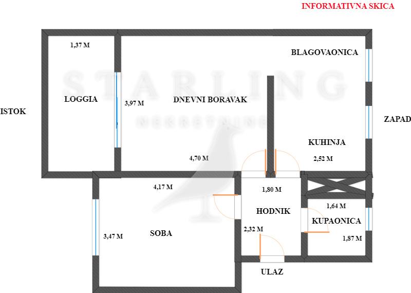 Stan se sastoji od dnevnog boravka, kuhinje s blagovaonicom, spavaće sobe, kupaonice s wc-om , hodnika i loggie.