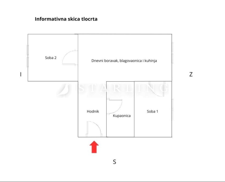Stan se sastoji se od dnevnog boravka povezanog s blagovaonicom i kuhinjom, dvije spavaće sobe, kupaonice s WC-om i hodnika.