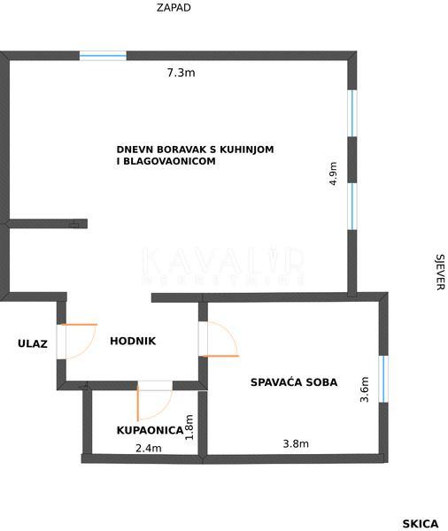 Stan se sastoji od dnevnog boravka s kuhinjom i blagovaonicom, spavaće sobe, kupaonice s wc-om te hodnika.