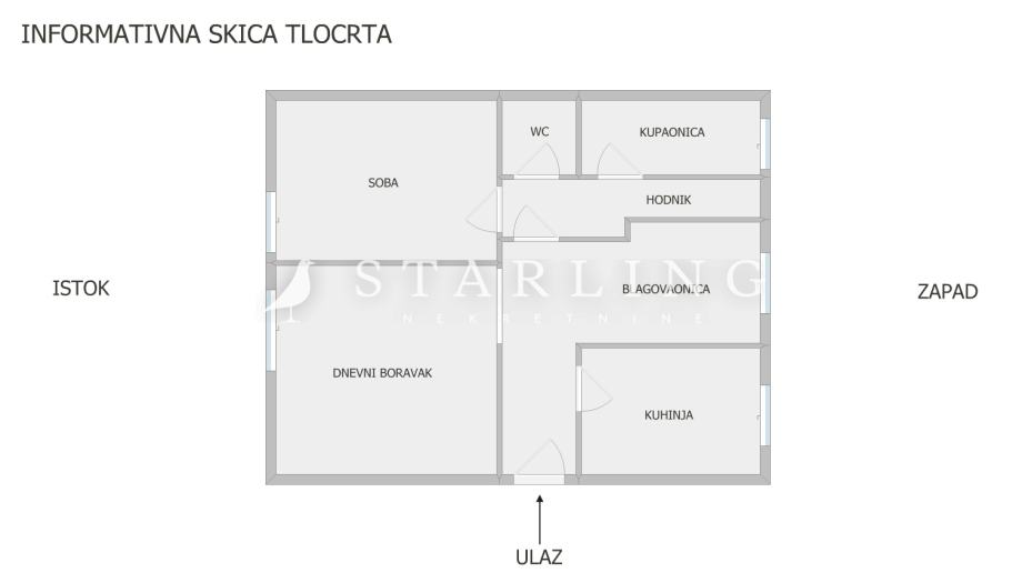 Stan se sastoji od dnevnog boravka, kuhinje, blagovaonice, spavaće sobe, kupaonice, odvojenog wc-a i ulaznog hodnika.